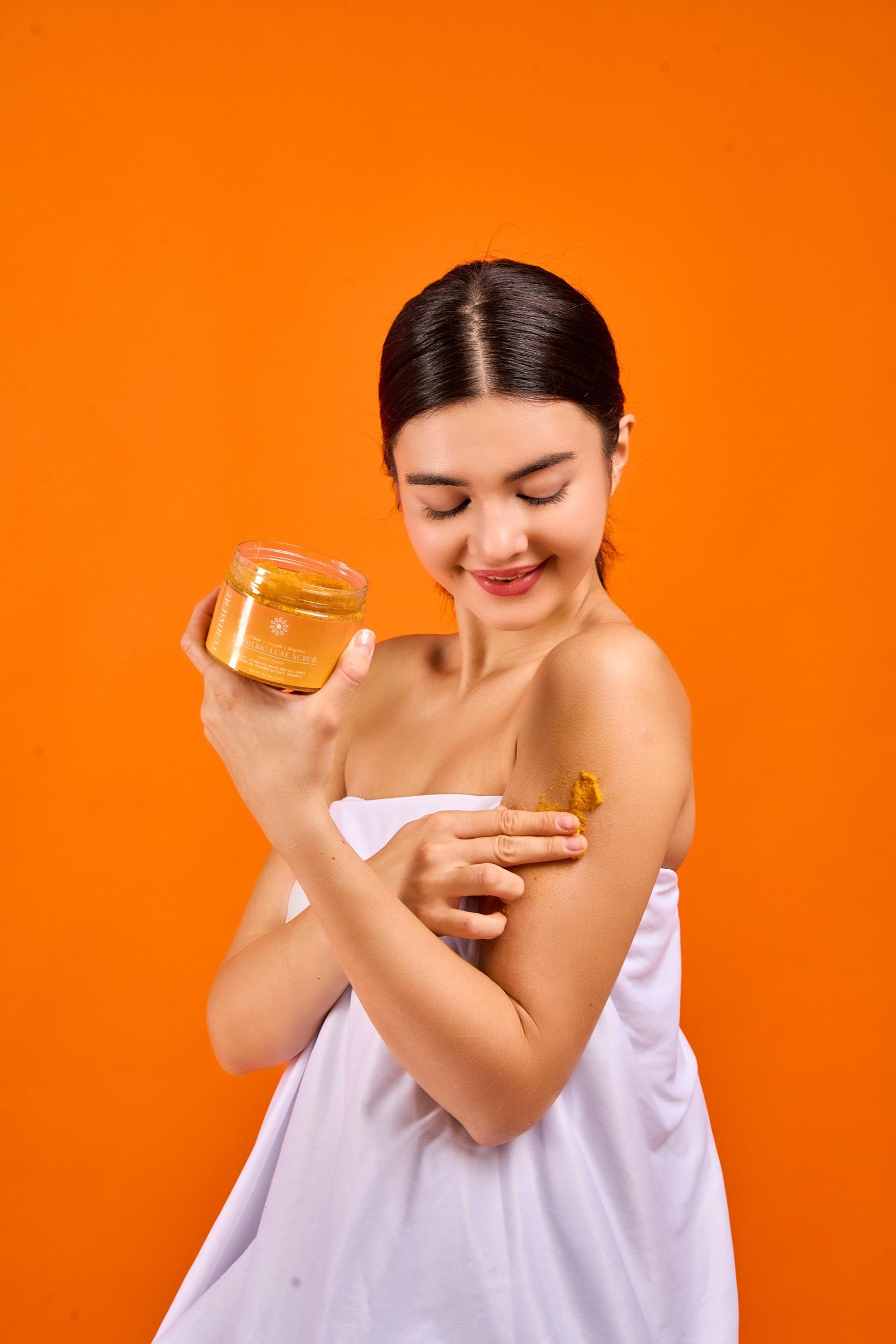 Our 100% organic, turmeric‑powered formula 🌼 is carefully balanced to exfoliate gently, nourish deeply 💧, and support sensitive skin — so you get a luminous, healthy glow worthy of a luxury spa 💛.